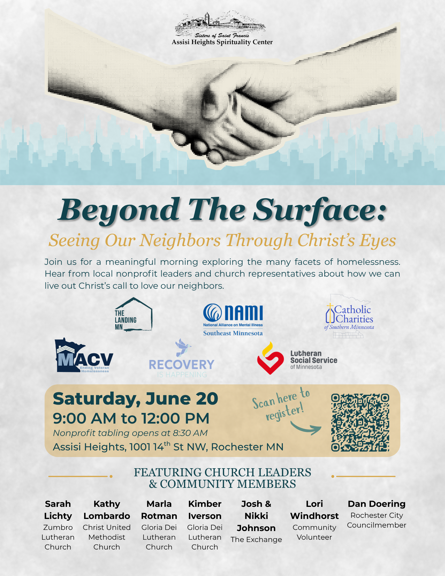 Join us for a meaningful morning exploring the many facets of homelessness. Hear from local nonprofit leaders and church representatives about how we can live out Christ's call to love our neighbors. This is a free event. Click here to learn more and register: https://rochesterfranciscan.org/events/beyond-the-surface-seeing-our-neighbors-through-christs-eyes/?preview=true